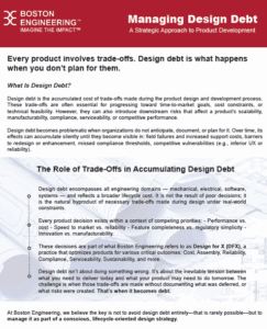 Design debt is the accumulated cost of trade-offs made during the product design and development process. Boston Engineering applies a rigorous, systems-level methodology grounded in DFX and contextual awareness to help clients recognize and mitigate the downstream costs of design decisions.